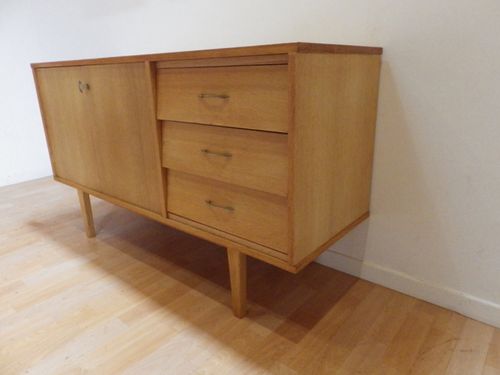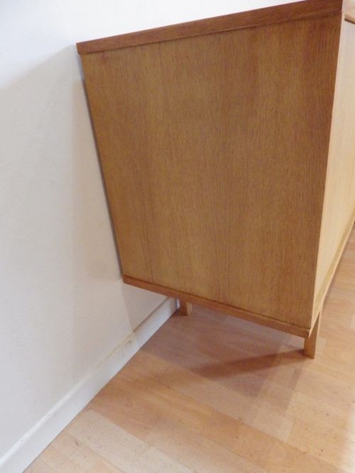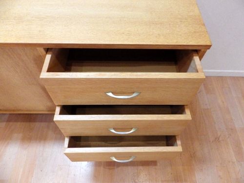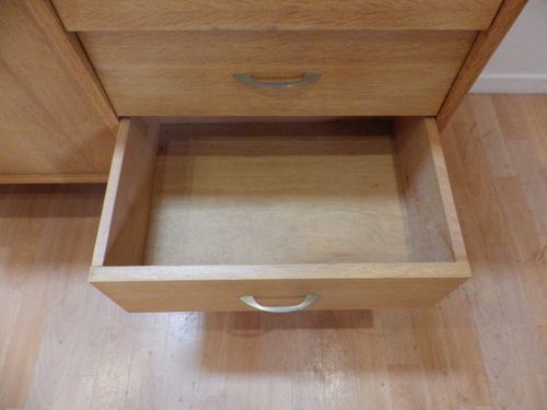 partie gauche avec 2 portes ouvrant sur 2 rangements 1 étagère, partie droite avec 3 tiroirs