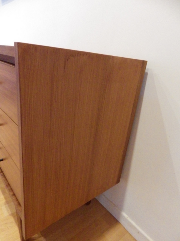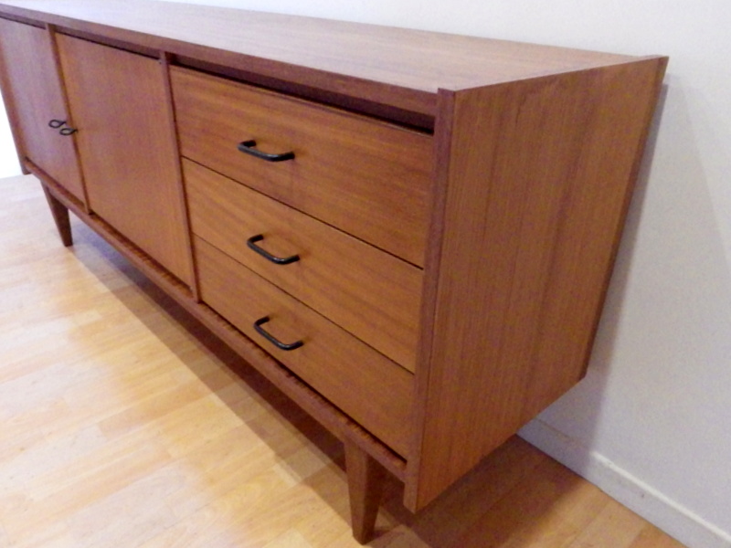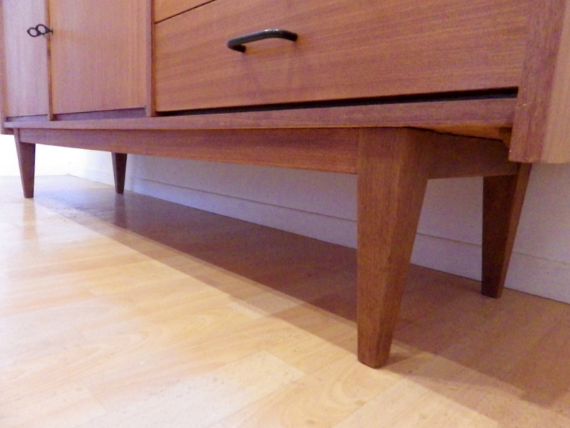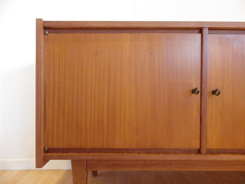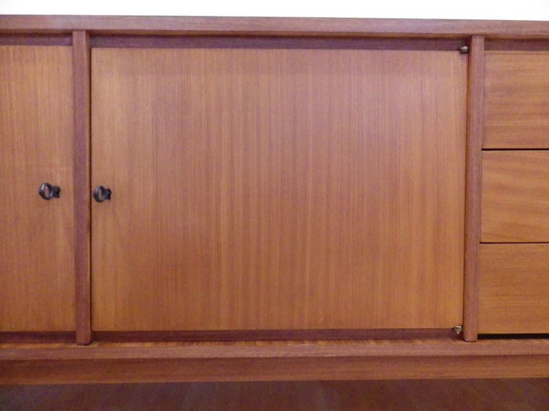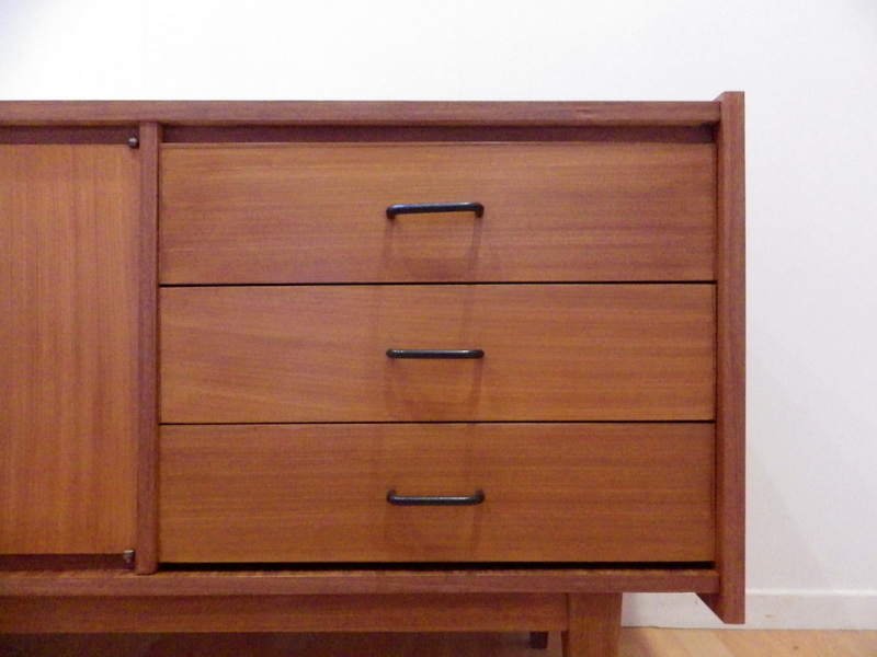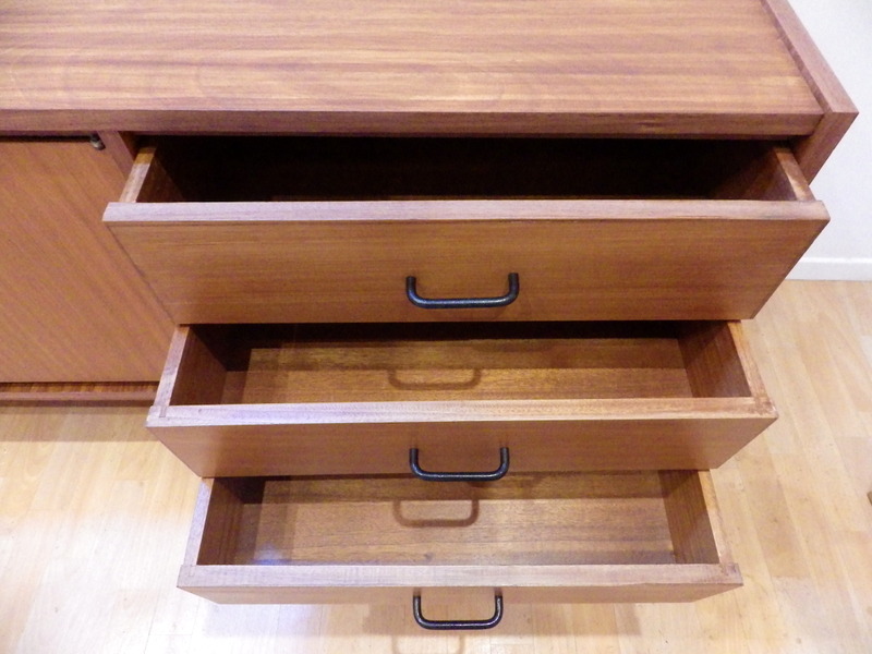 parties gauche et centrale avec 2 portes ouvrant sur 2 rangements 1 étagère, partie droite avec 3 tiroirs