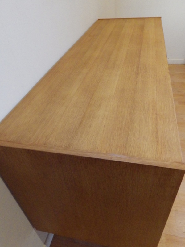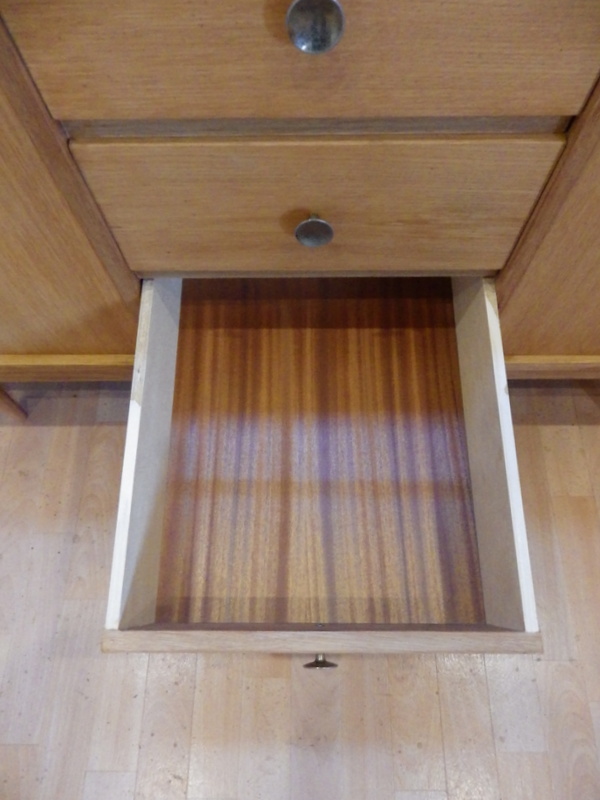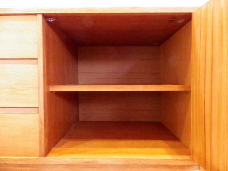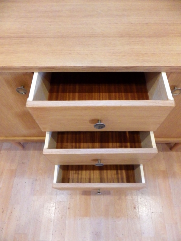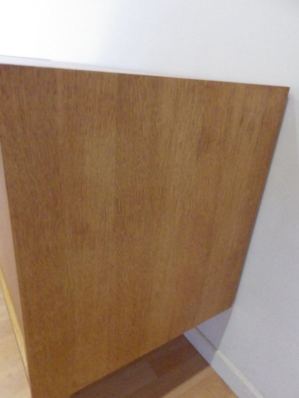 partie gauche avec 1 porte ouvrant sur 1 rangements 1 étagère, partie centrale avec 3 tiroirs, partie droite avec 1 porte ouvrant sur 1 rangement 1 étagère
